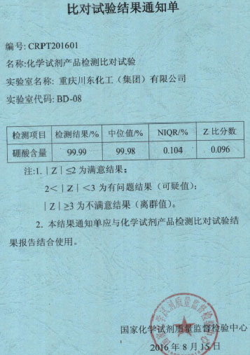 5月中旬,國家化學試劑質量監督檢驗中心(以下簡稱國家檢驗中心)發出通知,要求化學試劑檢驗機構參加2016年度化學試劑產品質量檢驗機構檢驗比對活動,按國家標準檢測硼酸樣品主含量。王副總接到通知后要求川東廠和試劑廠質檢部積極參加,以檢驗我公司檢測部門水平。